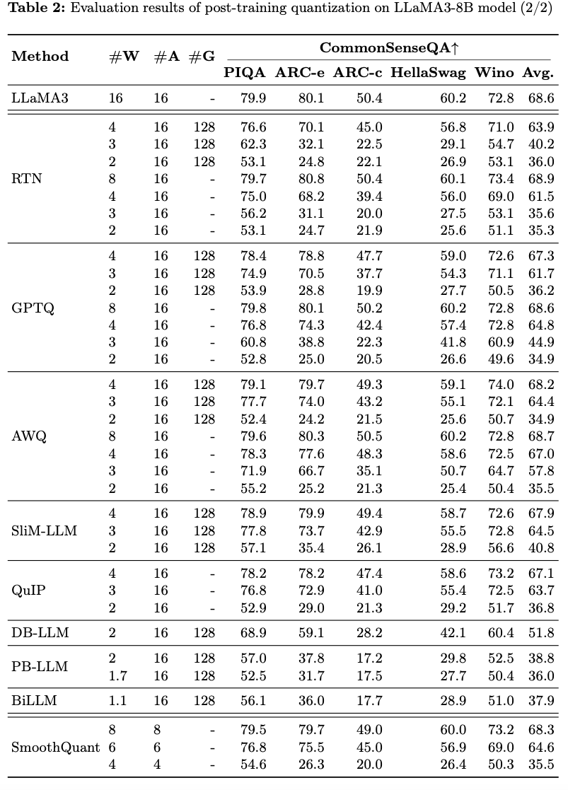 4-bit LLaMA3-8B의 평균 정확도는 57.0 (FP16: 64.8)으로,