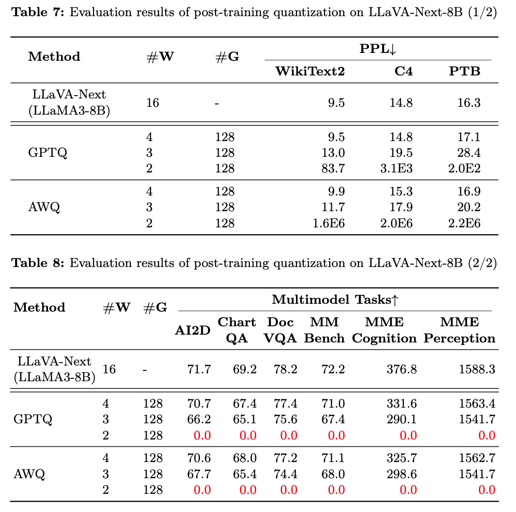 2-bit LLaVA-Next-8B는 GPTQ 또는 AWQ 방법을 사용하더라도 여섯 가지 multimodal QA 작업에서 완전한 기능 collapse.
