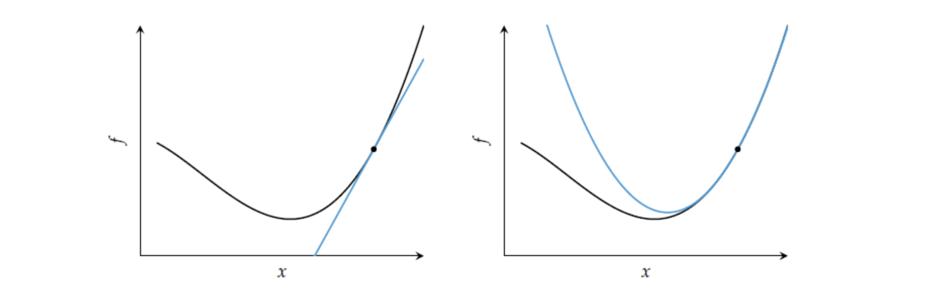 오른쪽 그림(second method)을 살펴보면 2차 근사에서 구할 수 있는 최소값이 최적해 근처에 위치할 것을 알 수 있다.