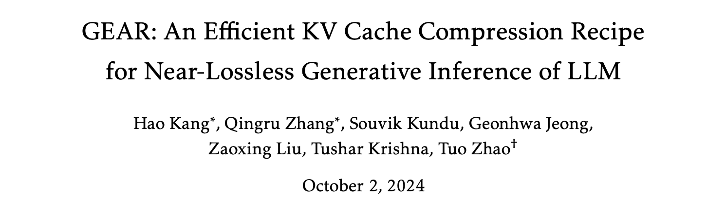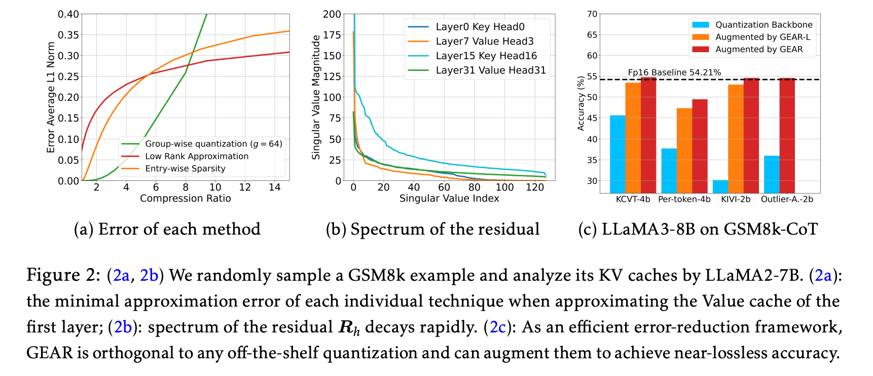 반면, GEAR는 이를 KV cache에서 tuning-free uniform quantization과 결합하는 가능성을 탐색한다.