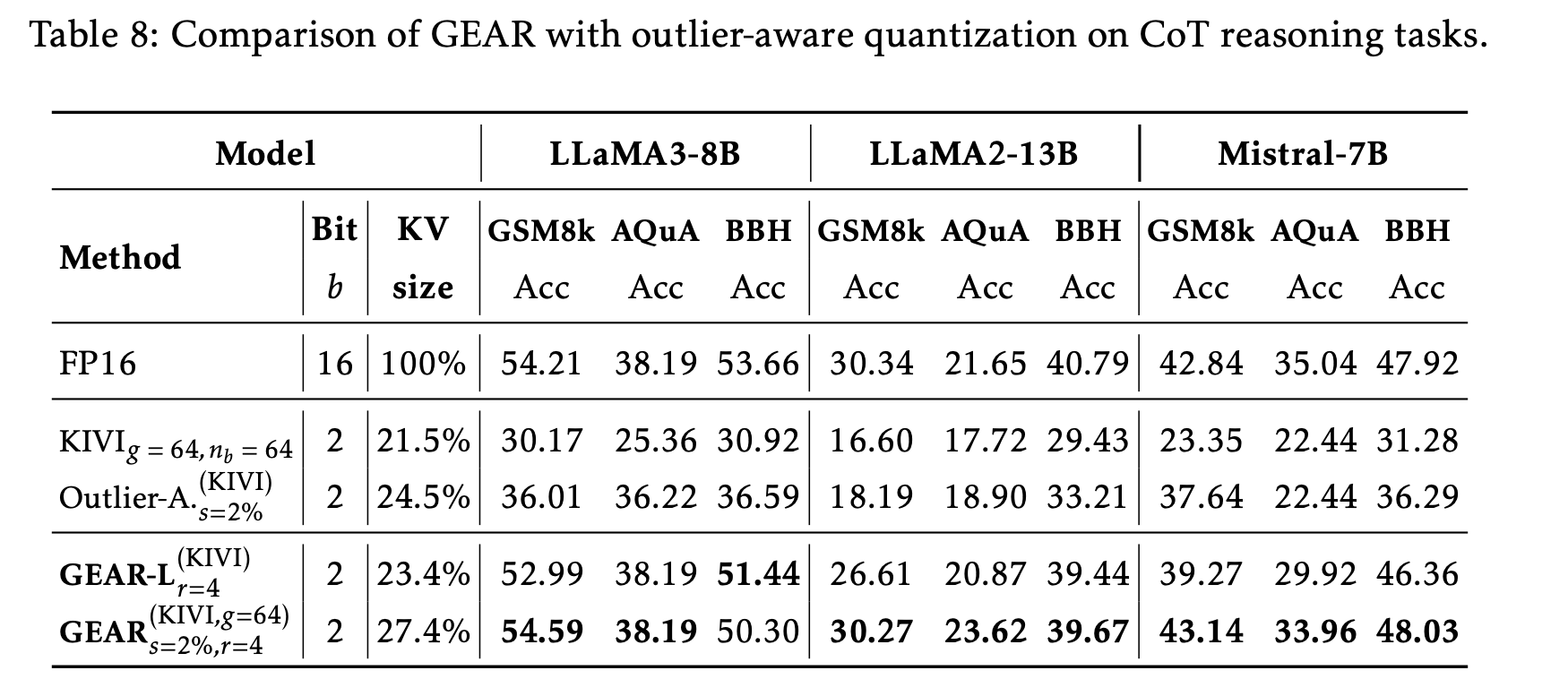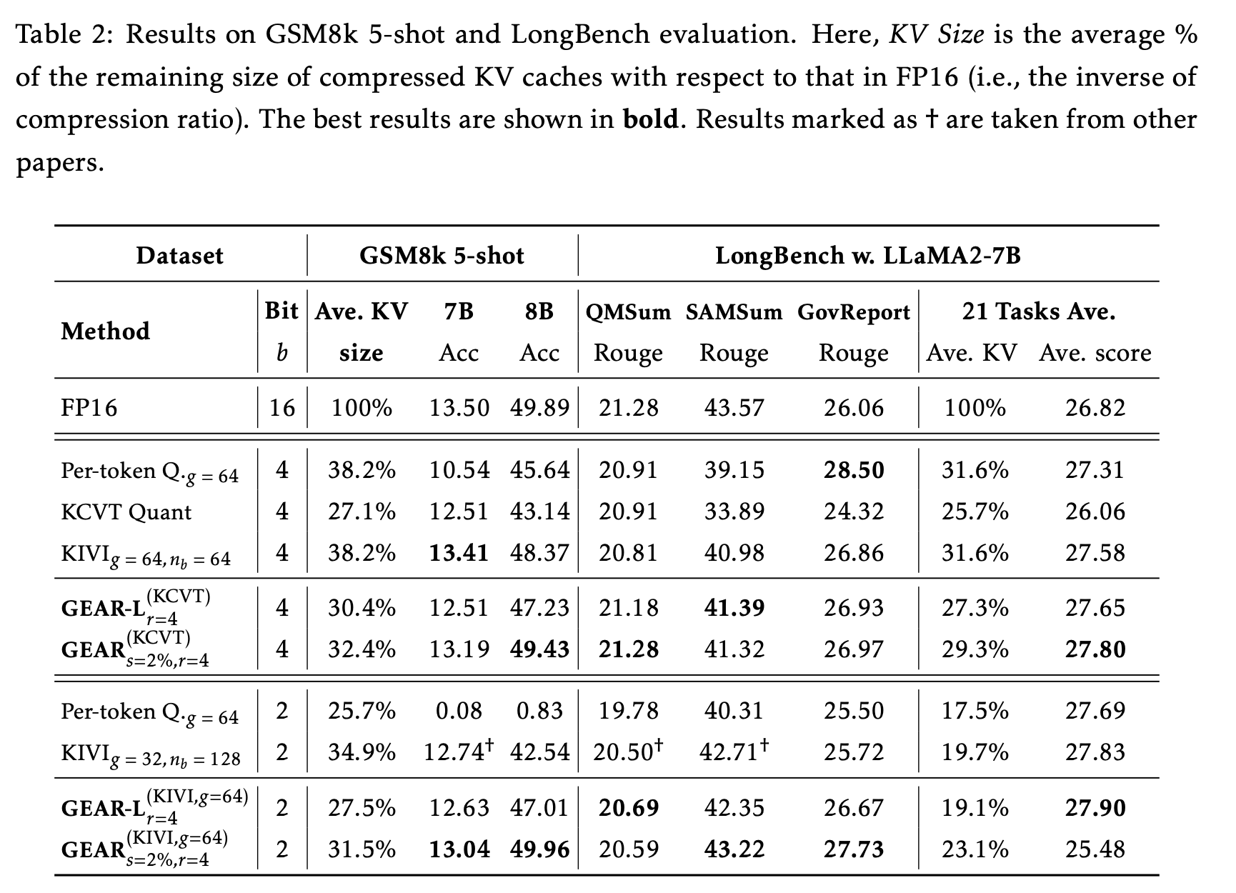 GEAR가 달성하는 near-lossless 2-bit performance에는 도달하지 못한다는 것을 확인할 수 있다.