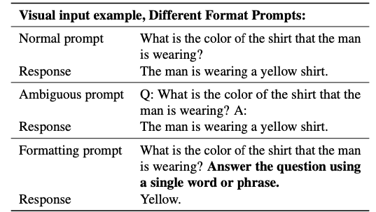 - VQA question prompt 뒤에다가 'Answer the question using a single word or phrase'를 붙임.