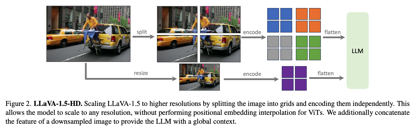 vision encoder가 원래 학습된 resolution의 작은 image patches로 분할하여 독립적으로 encoding함으로써 문제를 극복.
