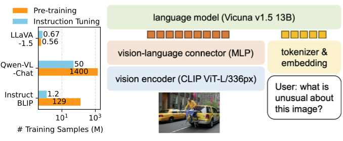 - LLaVA는 LMMs(Large Multimodal Models) 중 가장 단순한 아키텍처 디자인을 사용하며, 단지 600K 개의 image-text pair 데이터만으로 간단한 fully-connected projection layer를 학습