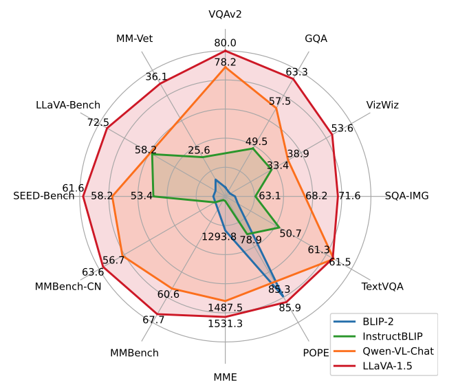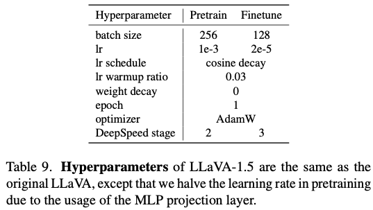 - LLaVA-1.5는 pretraining dataset과 training iterations 및 batch size를 LLaVA와 거의 동일하게 유지.