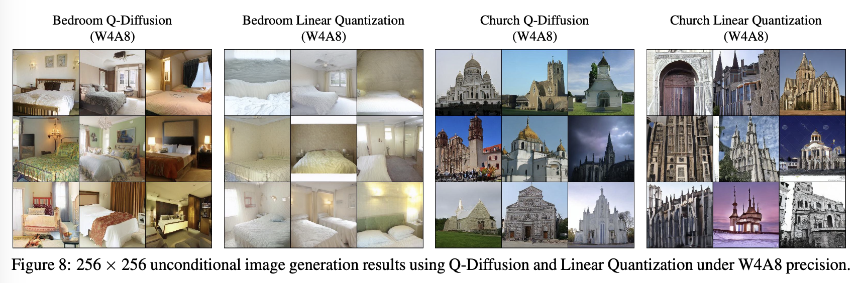 Linear Quantization과 비교해서, Q-Diffusion이 더 높은 quality image를 realistic한 detail과 더 나은 semantic information의 demonstration으로 보여줬다.