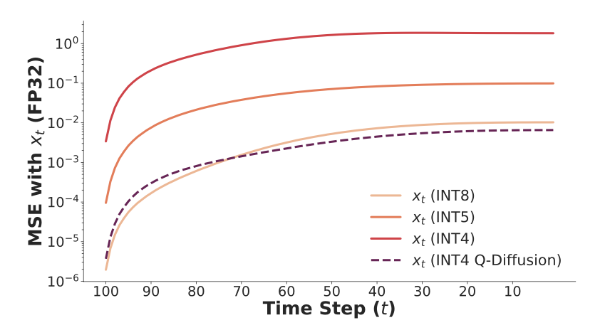 그리고 각 time step에서 full-precision 모델과 INT8, INT5, INT4로 quantized된 모델들의 MSE 차이를 비교했다.