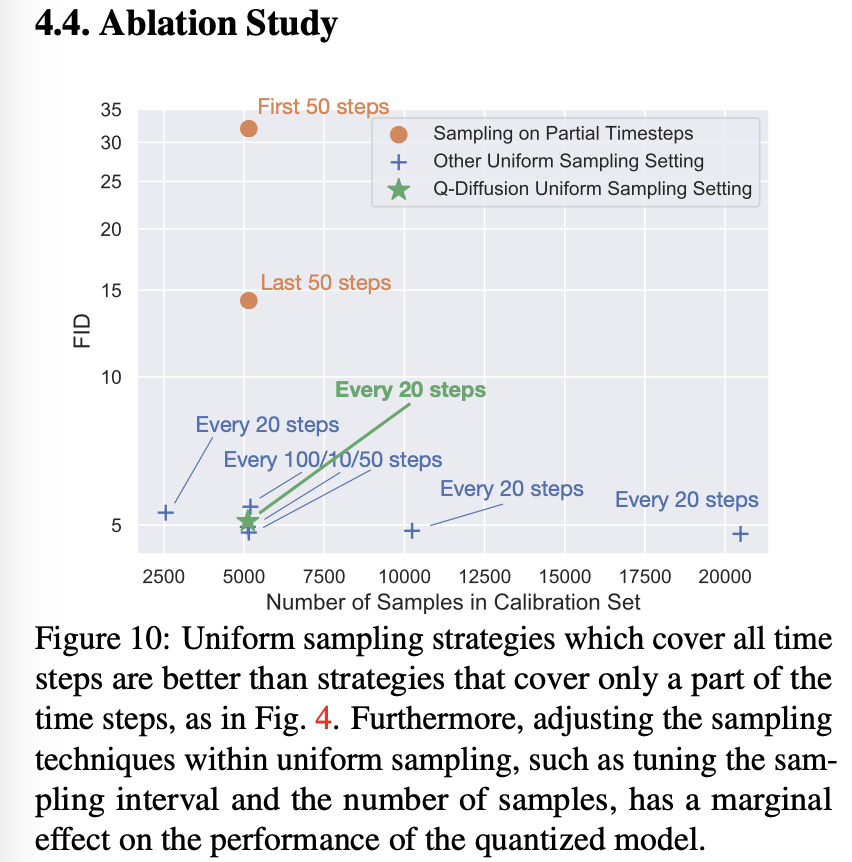 따라서, 우리는 calibration을 위해 단순히 총 5120 개의 샘플들에 대해 20 step마다 uniform하게 sampling 했다. 이를 통해 quantization 과정에서 low computational costs로 high-qulaity quantized model 결과를 얻었다.