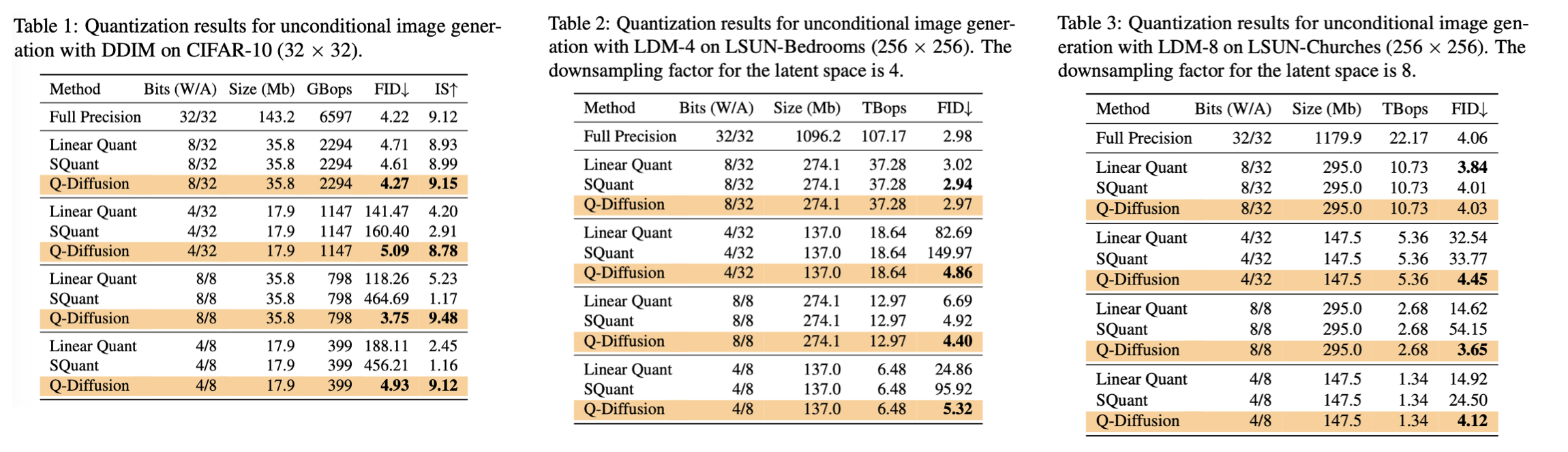 bit 수가 낮을 때, test한 diffusion 모든 resolution과 type에 대해 Linear Quantization을 large margin으로 outperform함을 보였다.