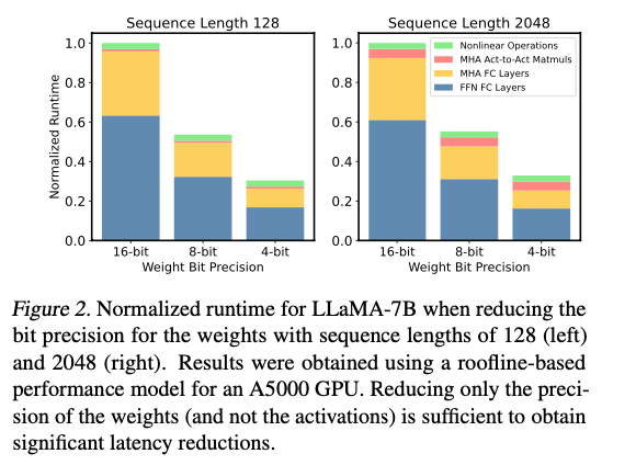 A5000 GPU에서 다양한 bit precision으로 LLaMA-7B의 runtime을 연구함. (Fig 2)