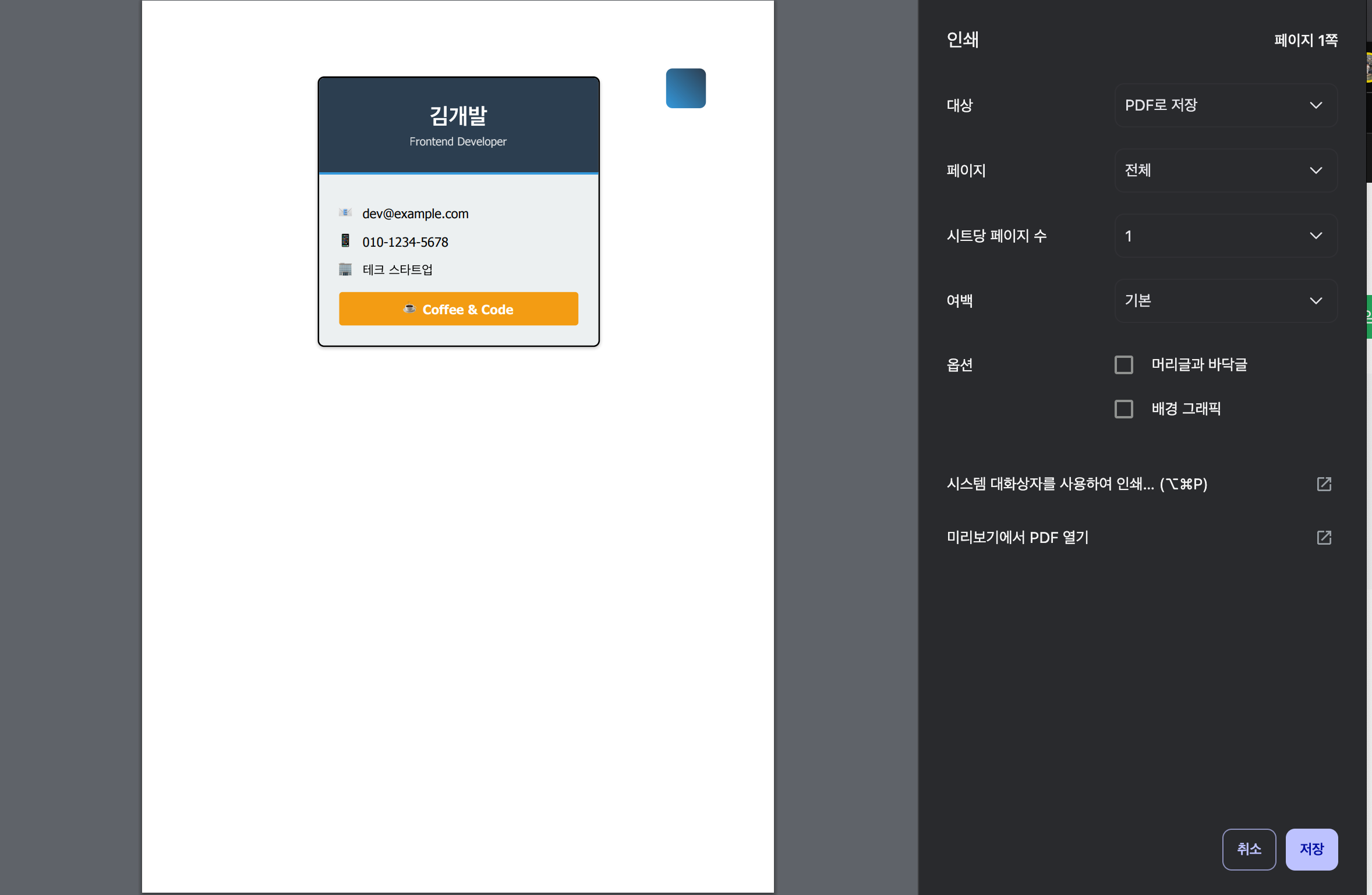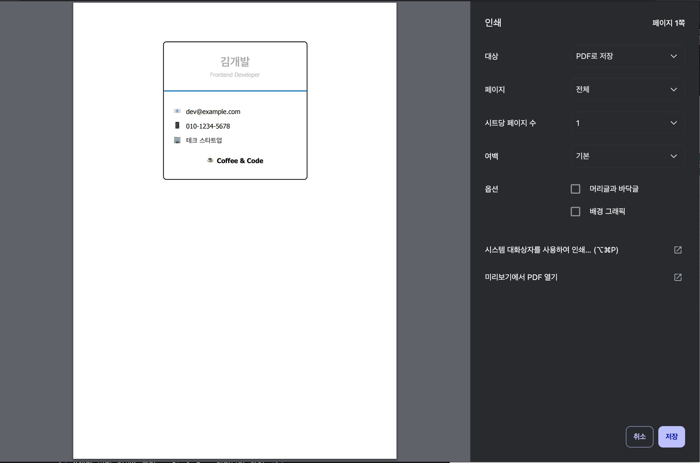 미리보기 페이지와 iframe은 요소가 조금 달랐습니다. A4 용지에 깔끔하게 보여야 하기 때문에 미리 보기 페이지와는 다른 레이아웃을 적용해야하고, header와 footer도 디자인이 달라서 새롭게 만들어야했습니다.