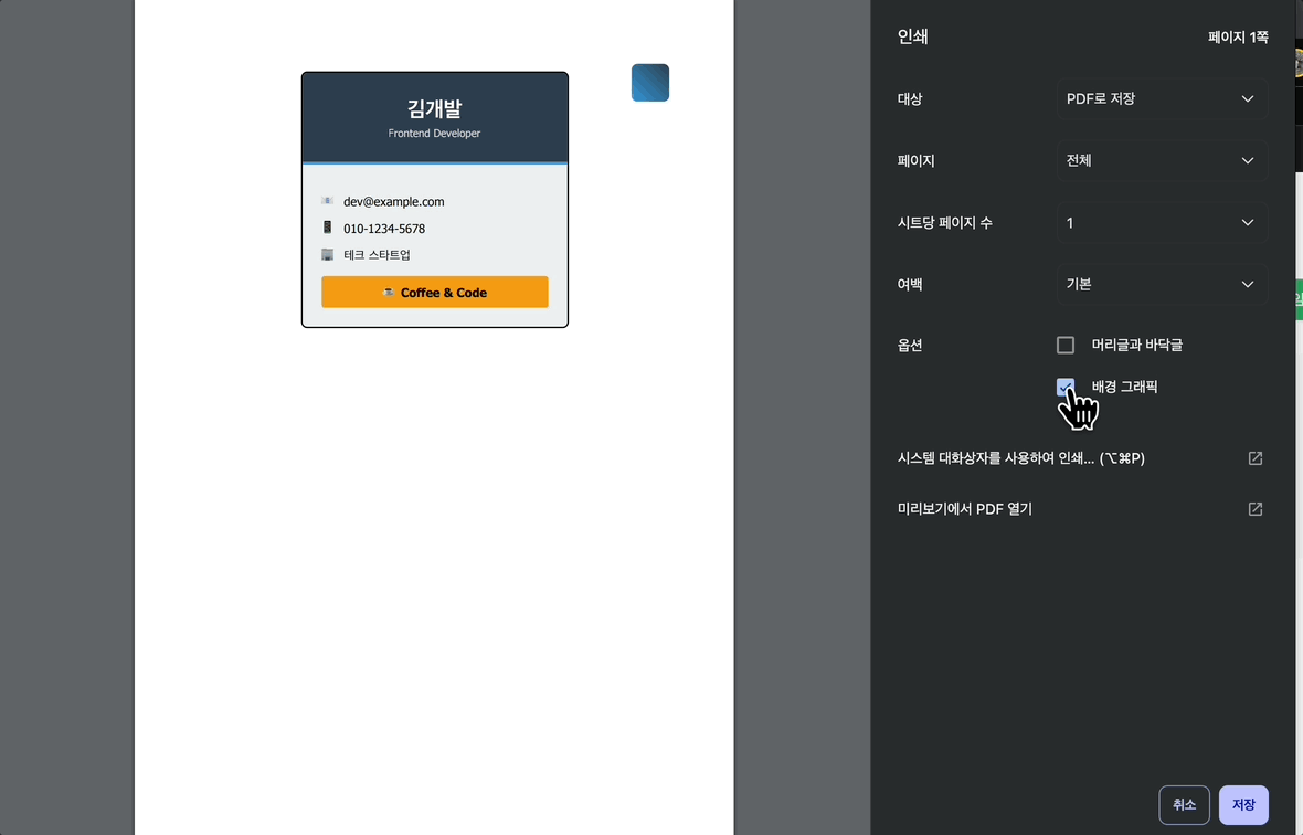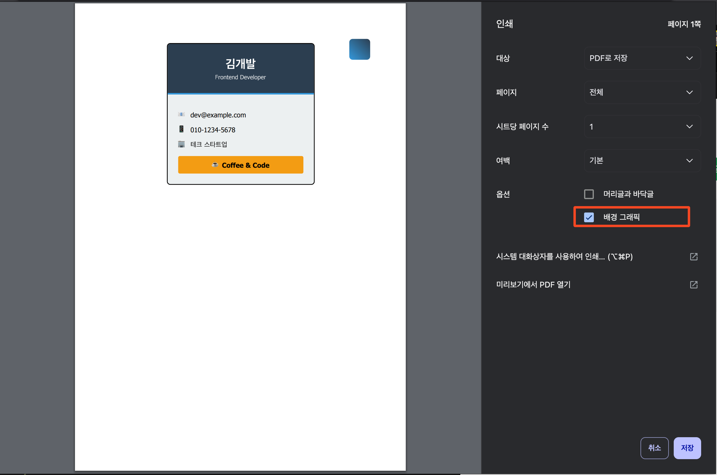 이제 '배경 그래픽'을 자동으로 활성화 해주면 됩니다. CSS에서 그 해답을 찾을 수 있었습니다.