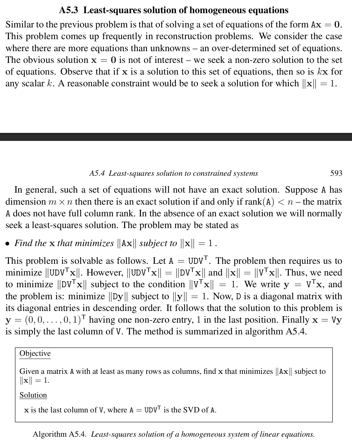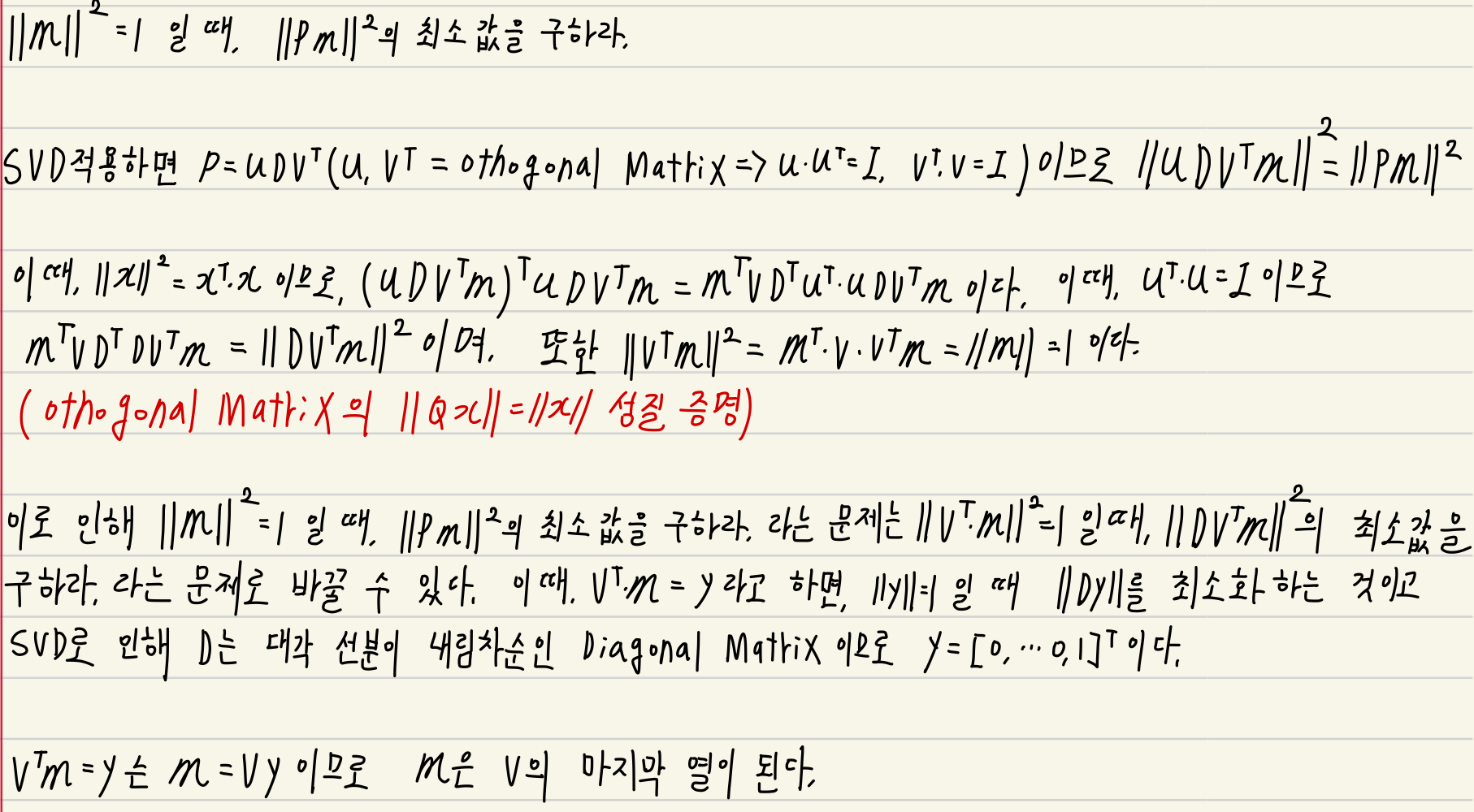 - 위 식을 풀기 위해 SVD (특이값 분해)를 사용함. P=UDVT일 때, |∣Pm∣∣2을 최소화하기 위한 m은 m = V의 마지막 열(벡터)임.