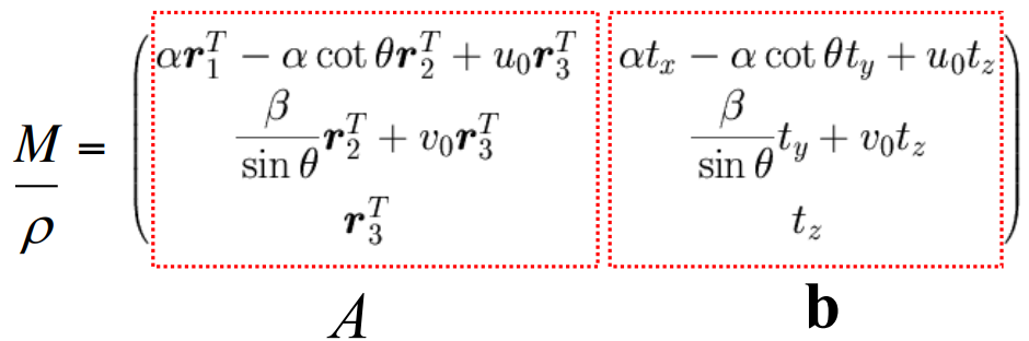M=ρ1⎣⎢⎢⎢⎢⎢⎡αr1T−αcot(θ)r2T+cxr3Tsinθβr2T+cyr3Tr3Tαtx−αcot(θ)ty+cxtzsinθβty+cytztZ⎦⎥⎥⎥⎥⎥⎤=[Ab]=⎣⎢⎡a1Ta2Ta3T⎦⎥⎤⎣⎢⎡b1b2b3⎦⎥⎤