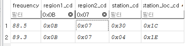 ‘fm_frequency’테이블에서 ‘region?_cd’ 값을 이전의 값들을 필터링하여, 얻을 수 있는 정보는 ‘frequency’, ‘station_cd’, ‘station_loc_cd’ 였다. 해당하는 값은 아래의 사진과 같다.