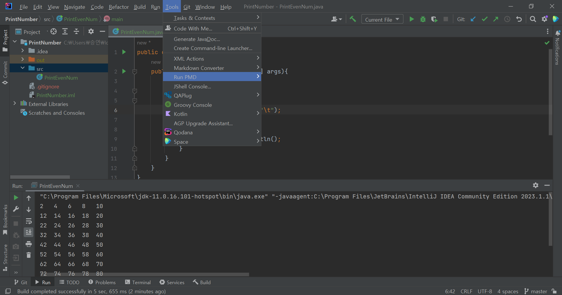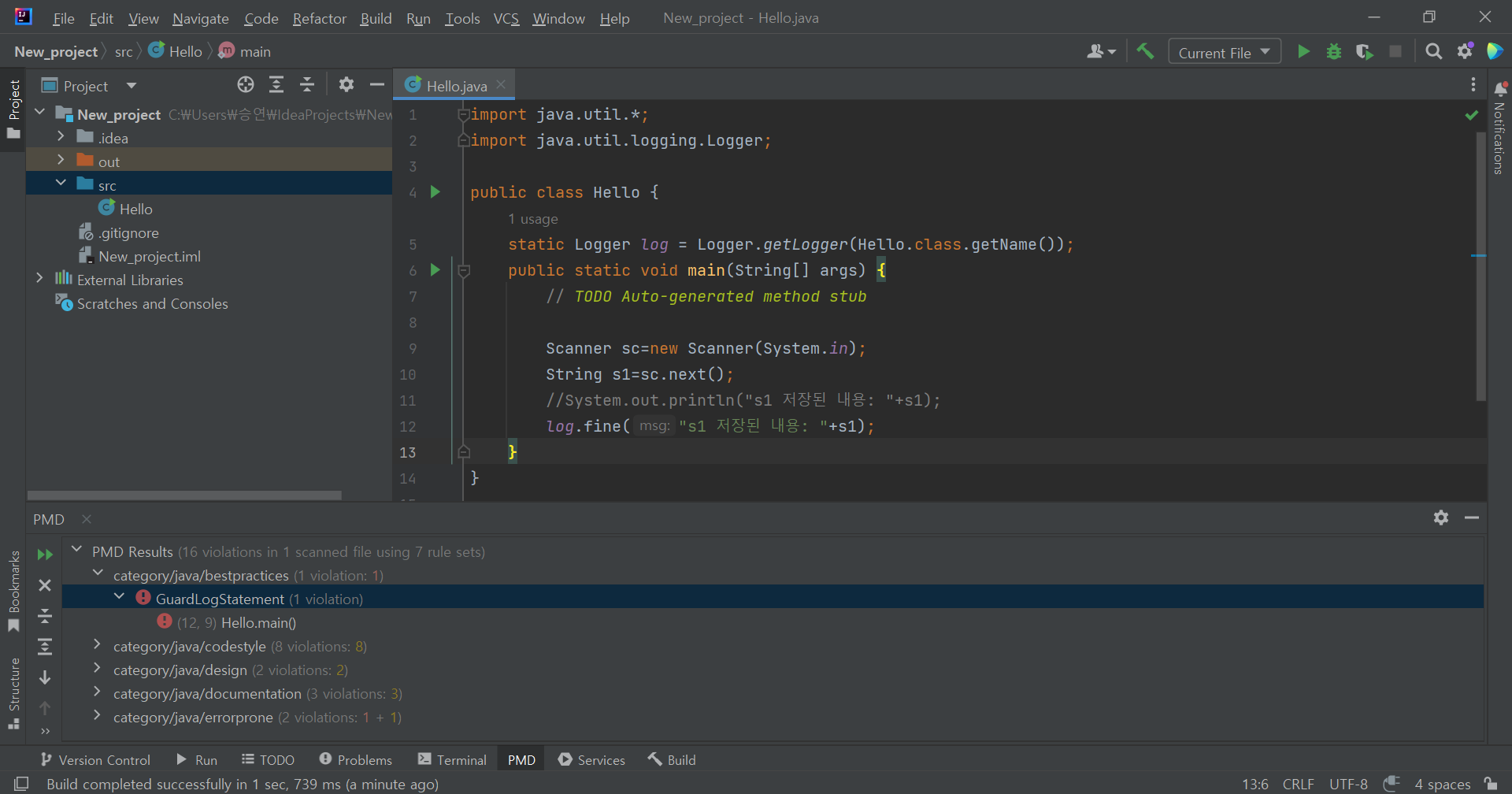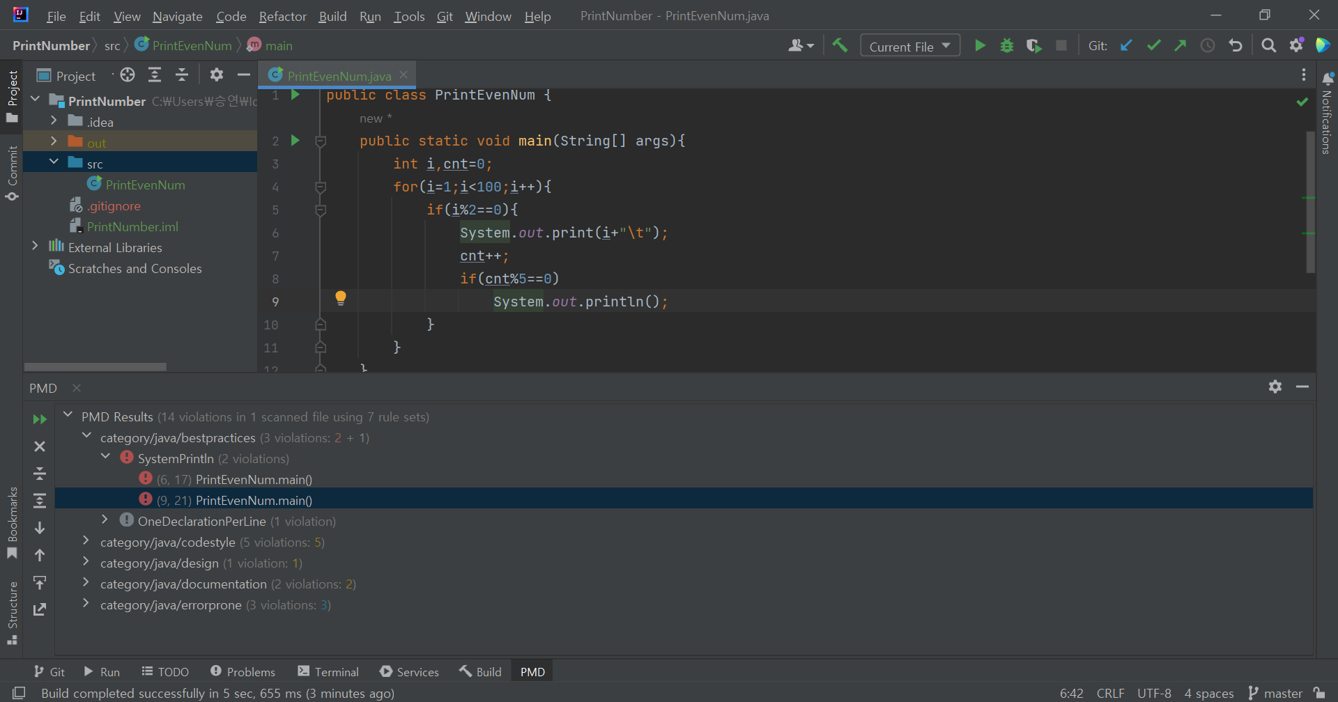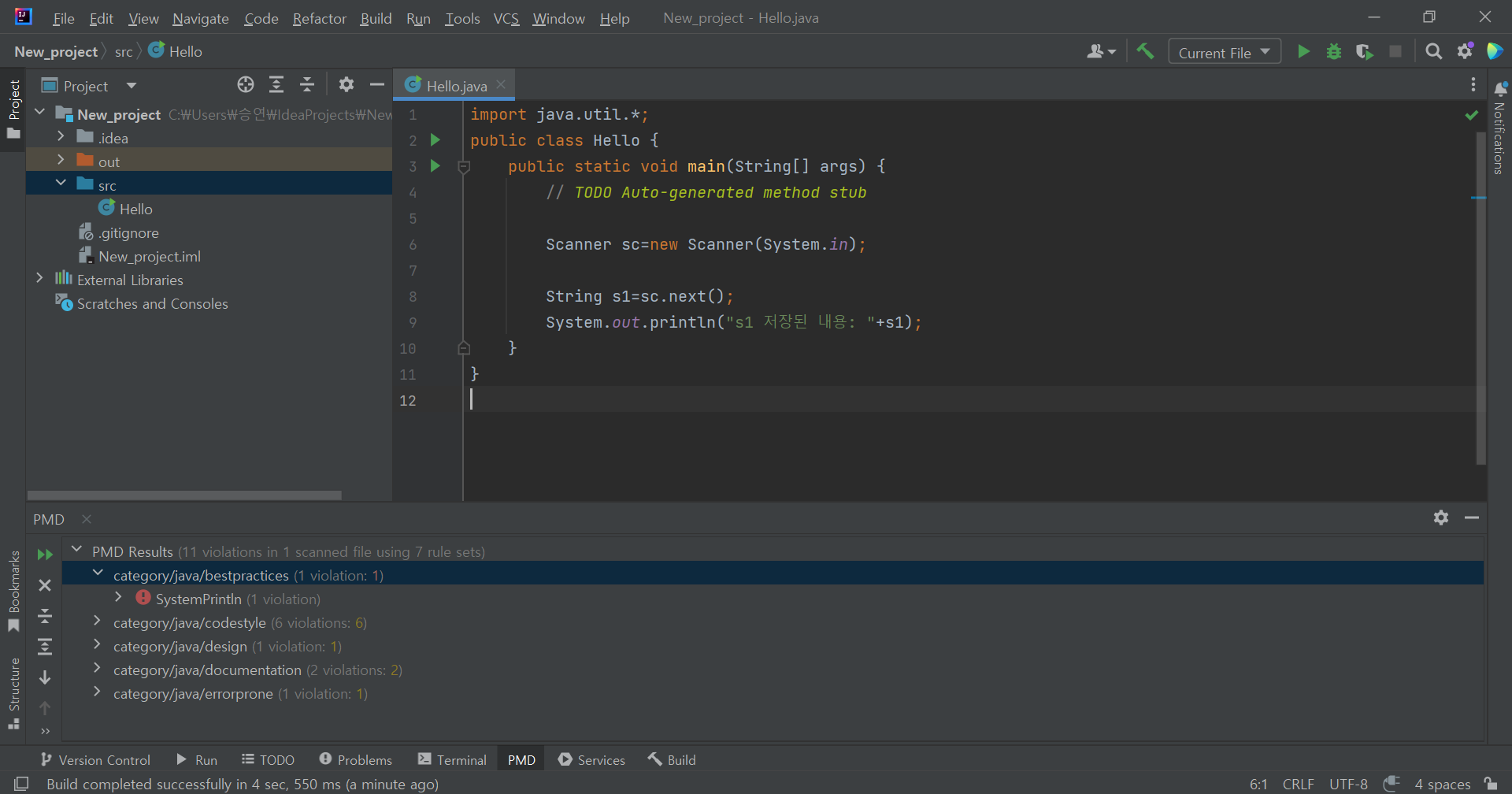 IntelliJ를 사용하여 짧은 코드를 써본 후 PMD를 실행시켜봄