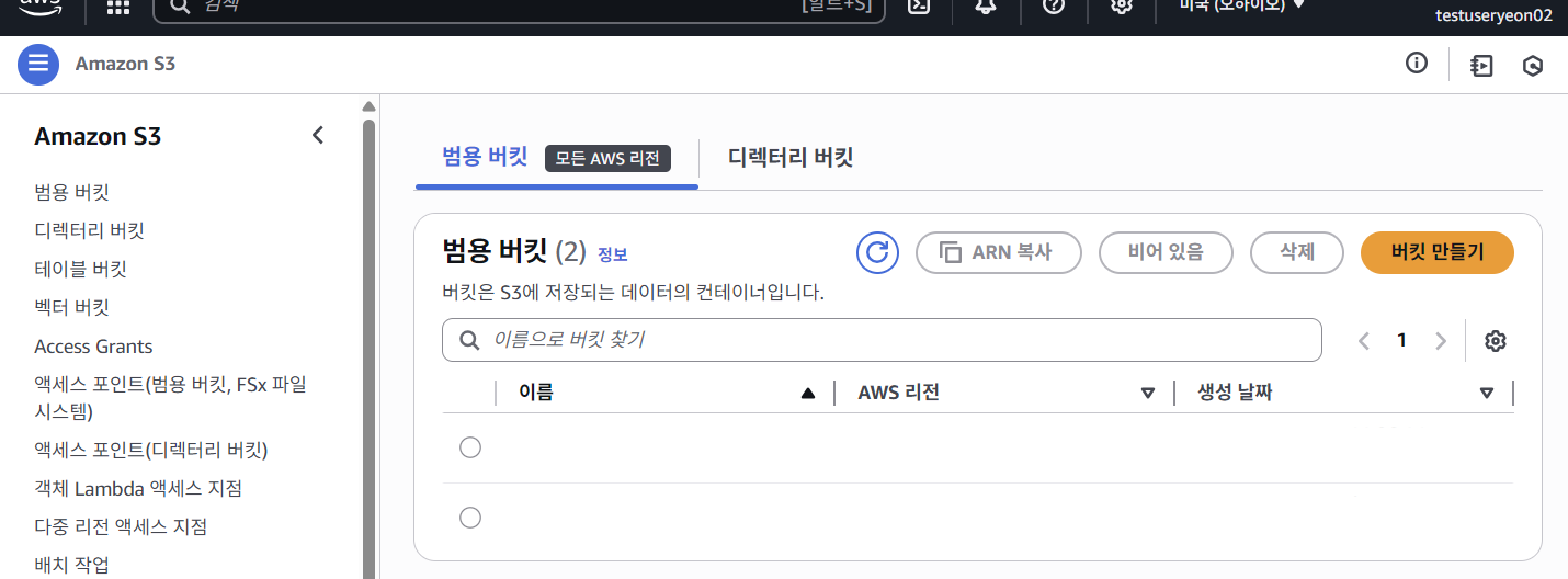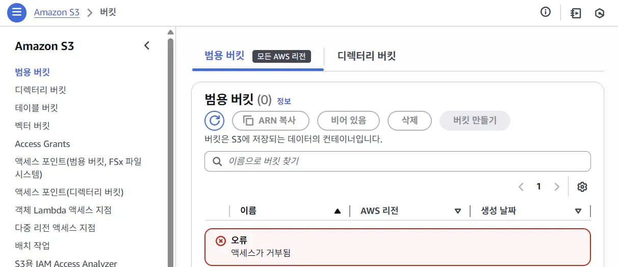 - 다시 EC2와 S3 권한이 없었던 IAM 사용자 계정에 접속하게 되면 아래와 같이 오류 문구가 뜨지 않는 것을 확인할 수 있다.