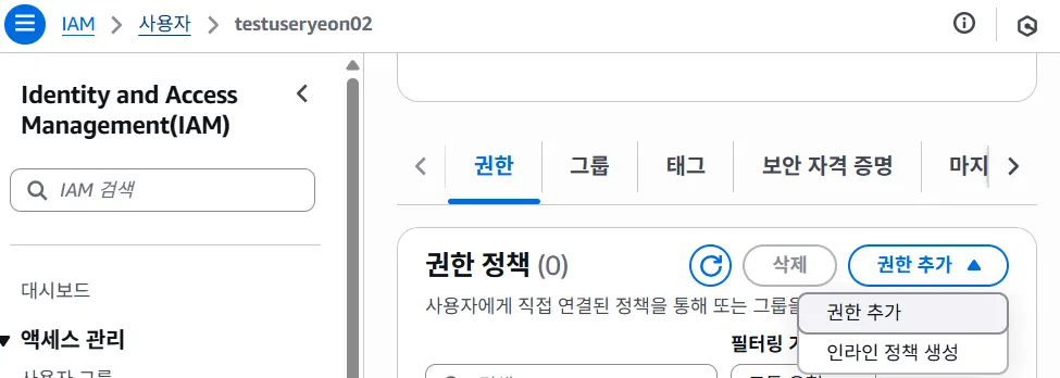 - 권한을 부여하기 위해 IAM의 사용자에 들어간다.