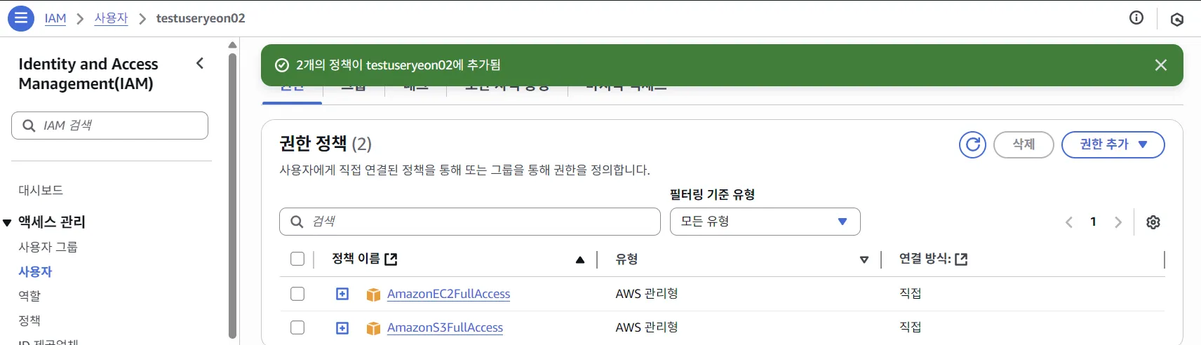 - 권한 정책 탭에서 S3와 EC2 서비스에 관한 모든 권한을 허용하도록 하는 정책인 'AmazonS3FullAccess'와 'AmazonEC2FullAccess'를 선택해주었다.