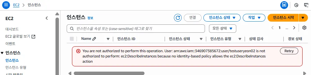 - EC2, S3 서비스 권한이 없는 IAM 계정에서 EC2 인스턴스에 접근하면 아래와 같은 문구를 볼 수 있다.