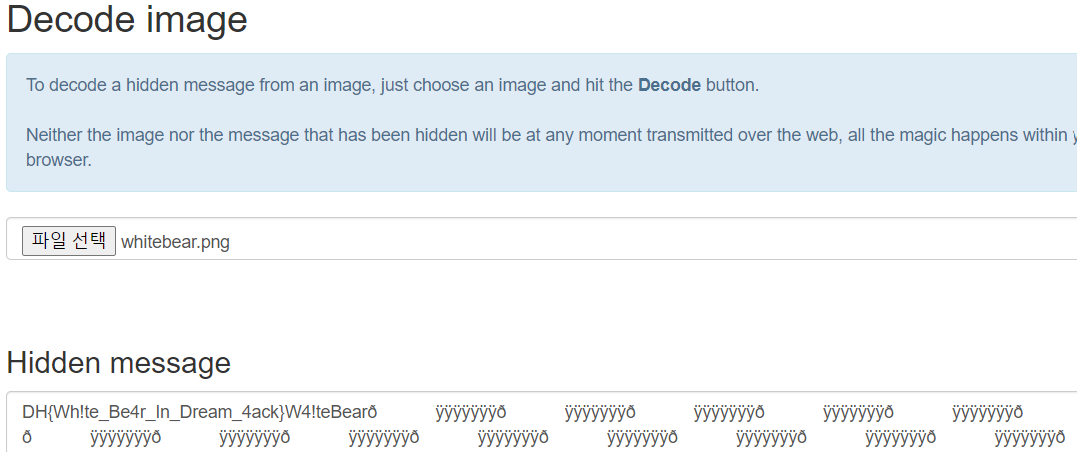 문제 설명 이미지 파일안에 Hidden 메세지가 숨어있다. keyword : W4!teBear flag : DH{flag}