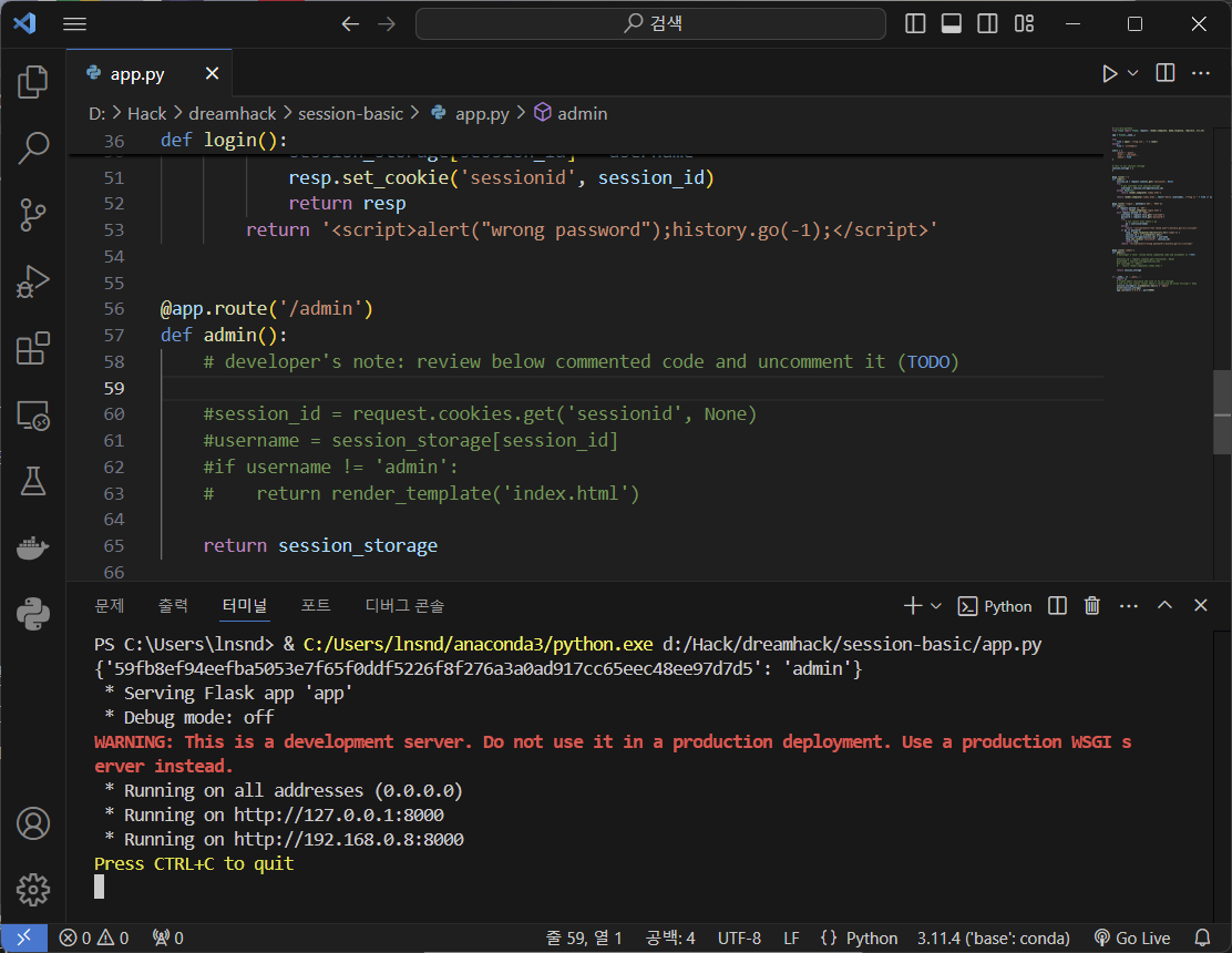 위에서 복사해두었단 admin의 쿠키값으로 추정되는 문자열을 user의 sessionid 값에 붙여넣기로 변조를 시도해보겠다.