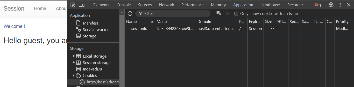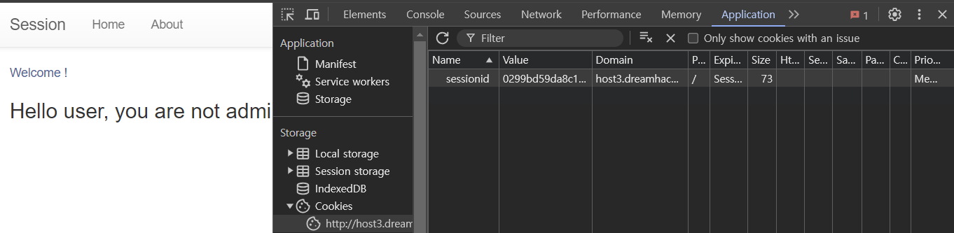 이때 개발자도구-Application으로 가서 쿠키값을 본다면 sessionid- Value 값을 확인해볼 수 있다.