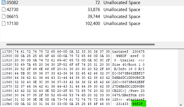 unallocated space 라는 폴더가 딱 보이는데, 문제 설명에 삭제된 PDF 파일이라고 했으니 파일 리스트를 보게 되면 숫자로 된 파일들이 보인다.