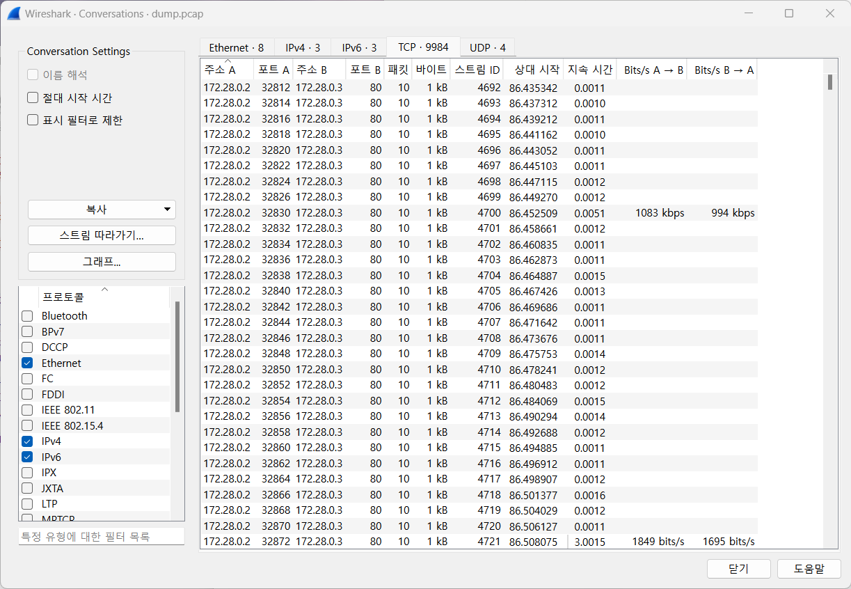 dump.pcap 을 와이어샤크에서 연 후, Conversations 창에서 TCP 탭을 클릭했다.