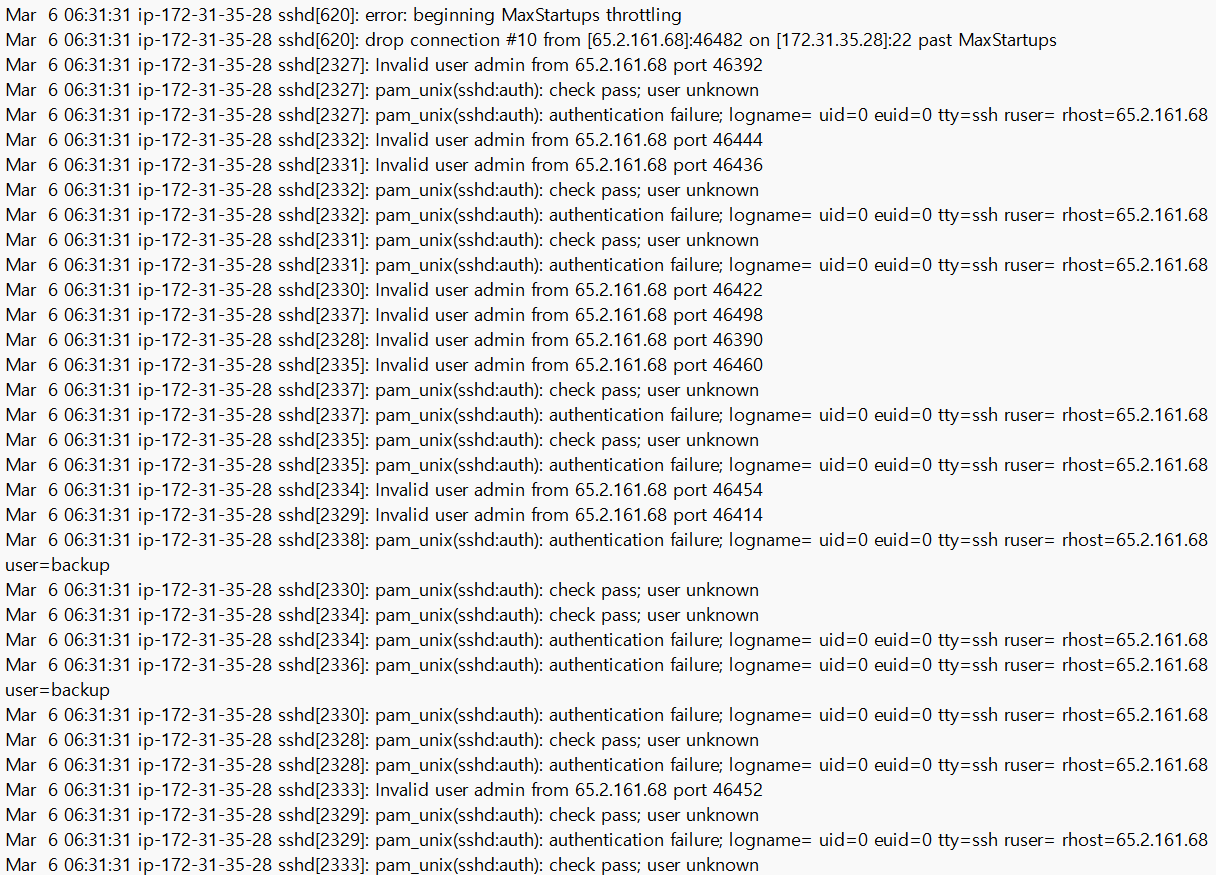 여기에서 공격자가 65.2.161.68 를 사용하여 Bruteforce attack을 시도하는 것을 알 수 있다.
