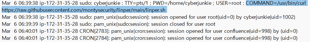 auth.log 파일의 하단에서 cyberjunkie 계정으로 명령을 실행했음을 알 수 있다.