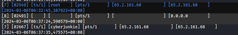 wtmp.txt 파일을 보면 위에서 공격에 사용한 65.2.161.68 을 통해 root 계정에서 터미널창을 실행했던 것을 확인할 수 있다.