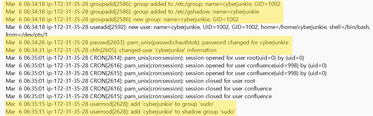 노란 부분을 보면 cyberjunkie 라는 username으로 sudo 그룹에 추가하여 관리자 권한을 갖게 되었음을 알 수 있다.