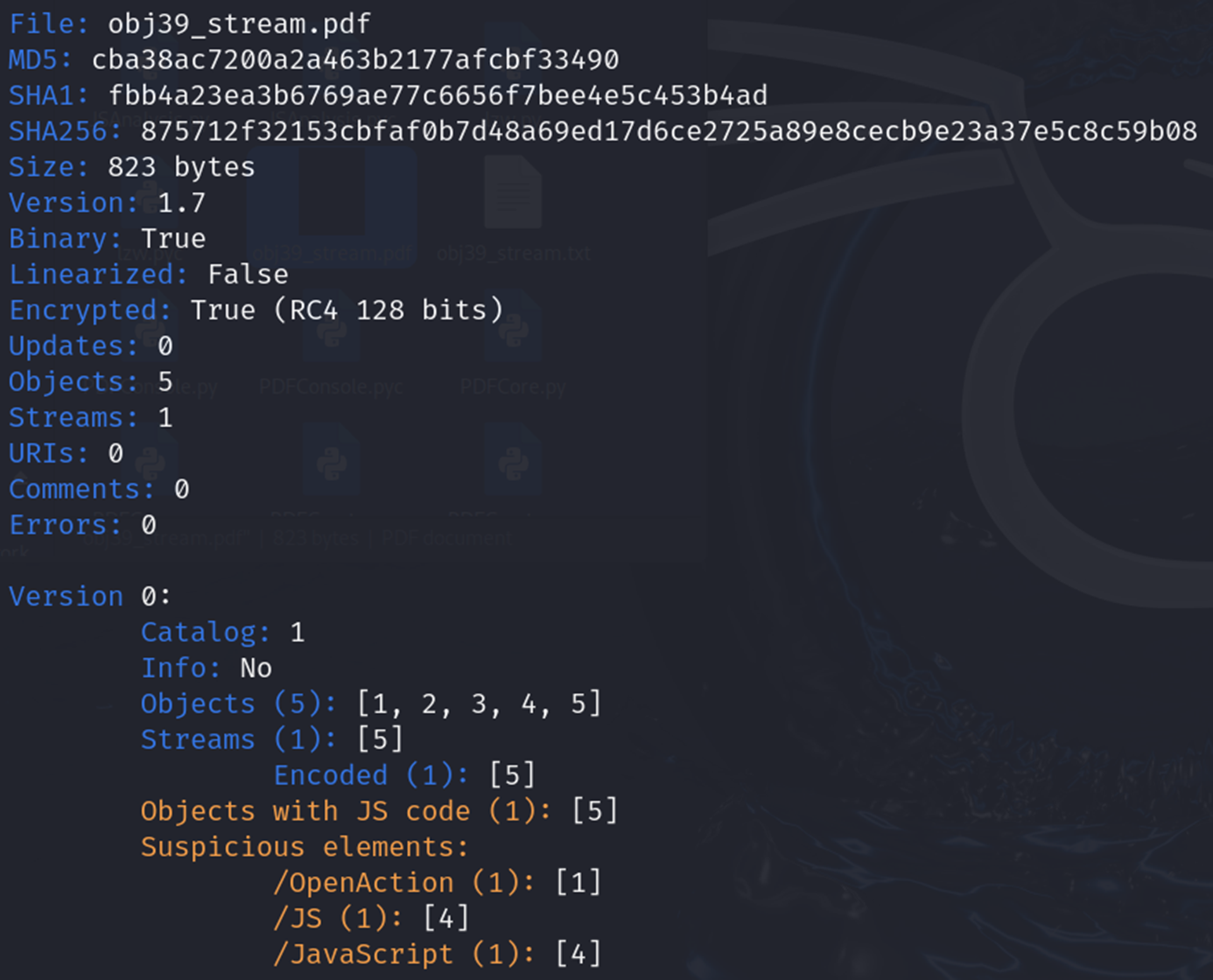 파일의 이름, 해시값, PDF 버전, 업데이트 횟수, 전체 객체 수, 스트림 수 등을 알려줍니다.