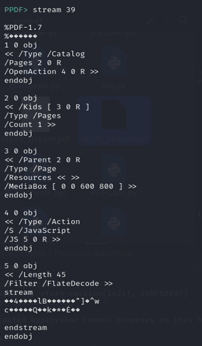 peepdf.py 실행 후,stream 39 라는 명령어를 이용하여 가장 수상했던 39번 객체의 데이터 정보를 알 수 있었습니다.