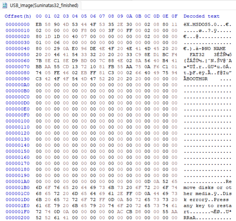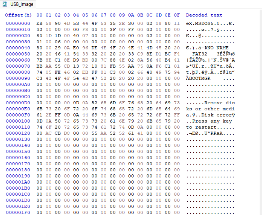 Boot Sector에서 부트 시그니처 값인 0x1FE~0x1FF에 위치한 값이 55 AA여야 하는데 0x126~0x127에 위치한 것으로 보아하니 아마 0으로 덤프된 값이 삭제된 것이 아닐까 생각하며 부트 시그니처 부분이 0x1FE에 올 때까지 0을 삽입했다.