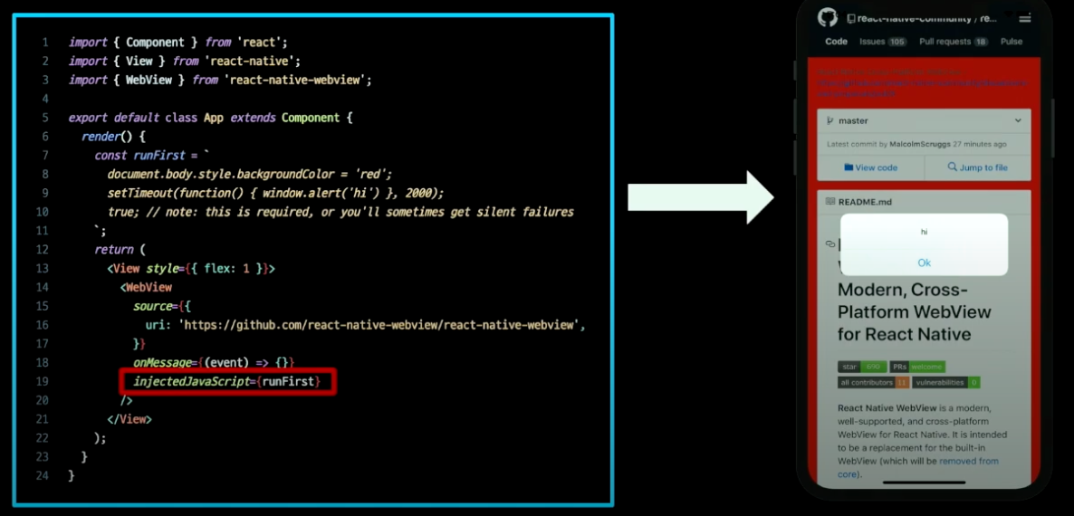 (삽질금지) injectJavaScript만 사용하더라도, onMessage도 스크린샷과 같이 넣어줘야 받을 수 있다.