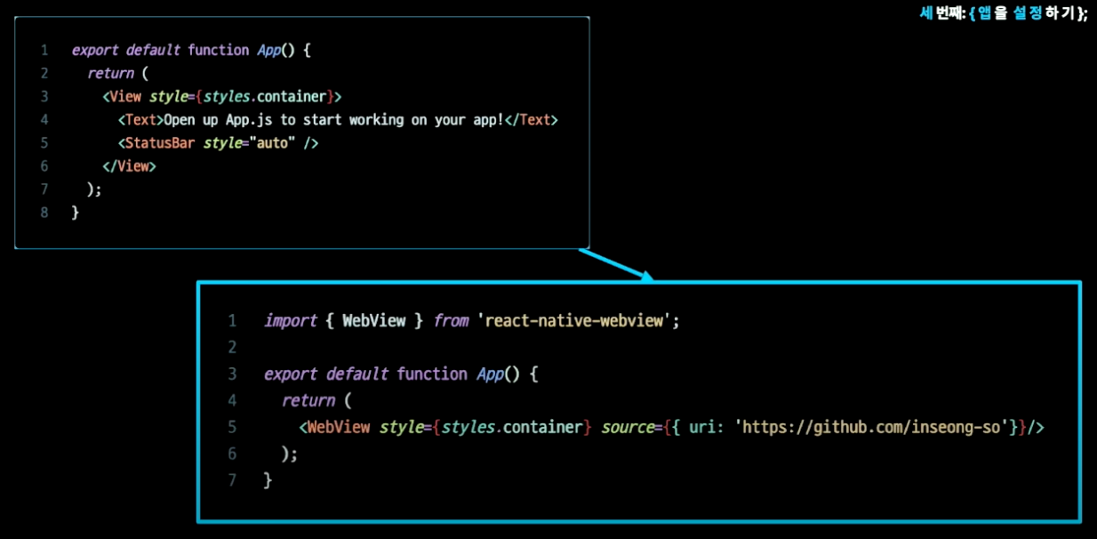 2-2 webview라이브러리만 설치하면 자동으로 웹뷰로 감싼 프로젝트가 생성되는 줄 알았는데, 직적 import해서 쳐야 함! 아래 코드 복사!