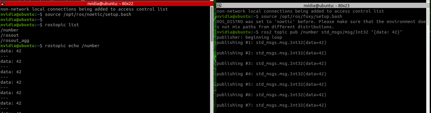 다음과 같이 오른쪽 foxy에서 메시지를 publish하면 왼쪽 noetic에서 subscribe하는 것을 볼 수 있습니다.