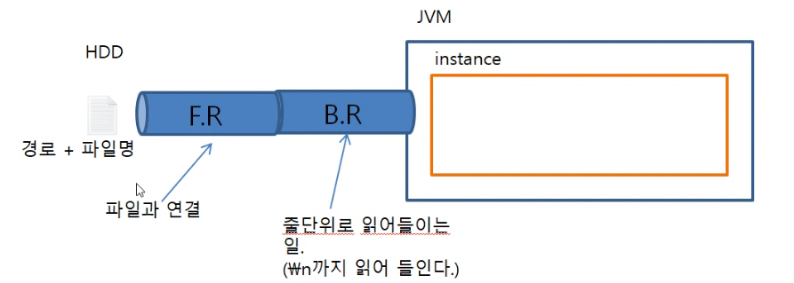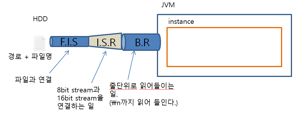 File file = new File("경로");FileInputStream fis = new FileInputStream( file );InputStreamReader isr = new InputStreamReader(fis);BufferedReader br = new BufferedReader(isr);BufferedReader br = new BufferedReader(new InputStreamReader(new FileInputStream( new File("경로"))));String str = "";