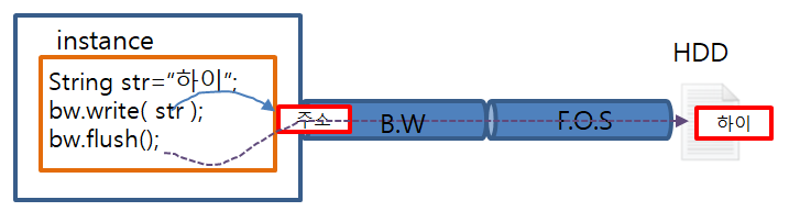 // flush()를 하지 않아도 연결만 끊어주면 자동으로 스르팀 안에 내용이 flush되고 연결이 끊어진다.BufferedWriter를 사용한 출력