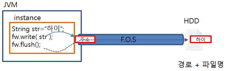 File file = new File("경로/파일명");FileOutPutStream fos = new FileOutPutStream( file );String str = "하이";