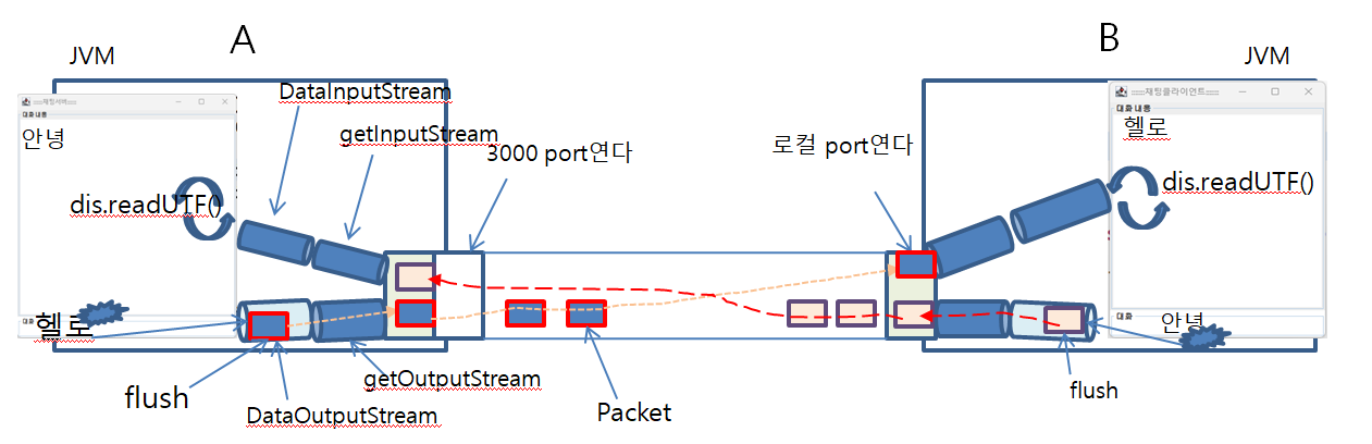 }dos.flush();dos.writeUTF("메시지");dos.flush();```java