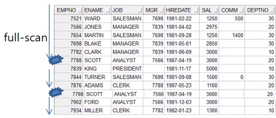 full-scan : 비교값에 해당하는 컬럼 값을 위에서 부터 아래로 전체 레코드를 검색하면서 조회한다.