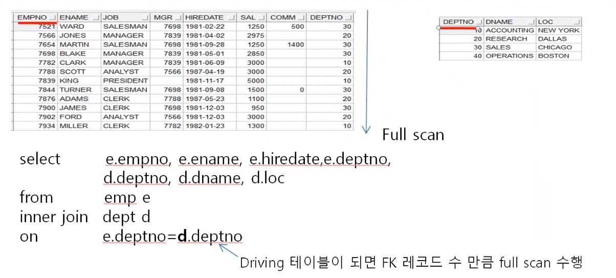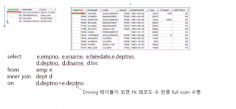 - 관계가 있는 테이블에서는 PK컬럼이 driving 테이블이 되는 것이 좋다.