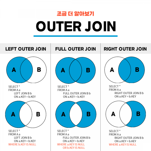 종류 : left, right, full -> 레코드가 존재하는 테이블을 선택