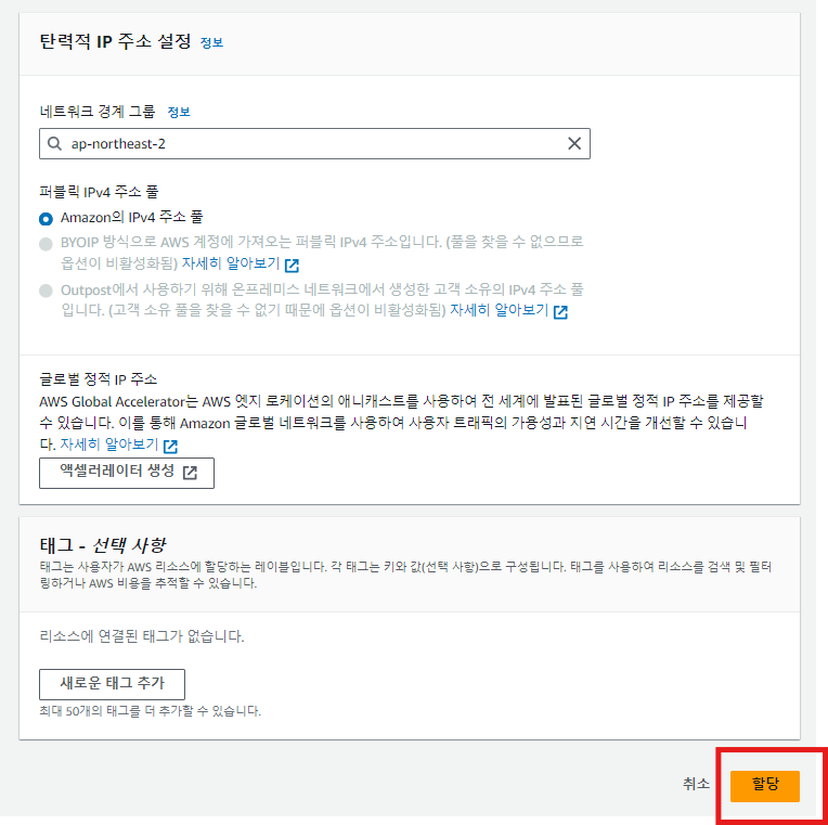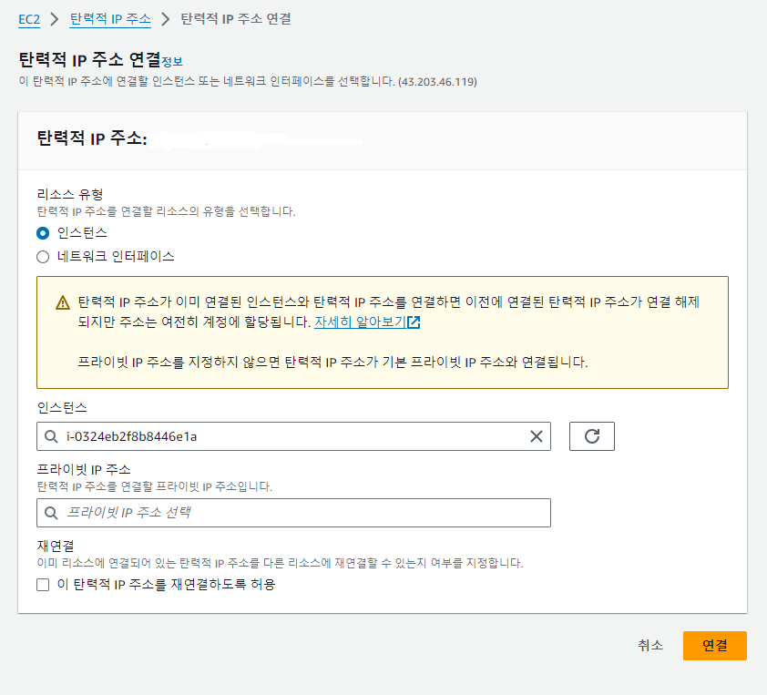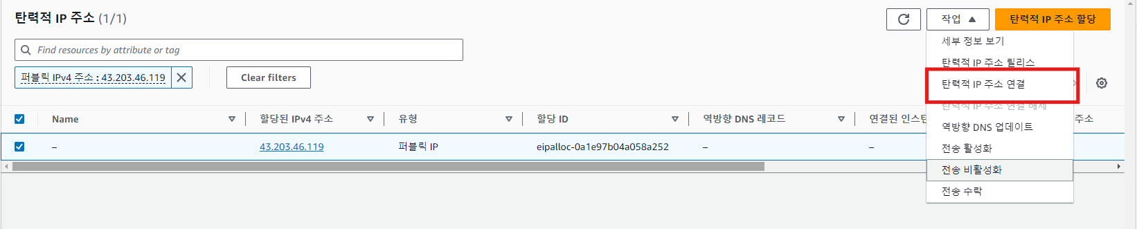 탄력적 IP 선택한 후 > 작업 > 탄력적 IP주소연결