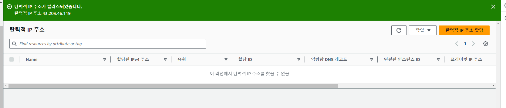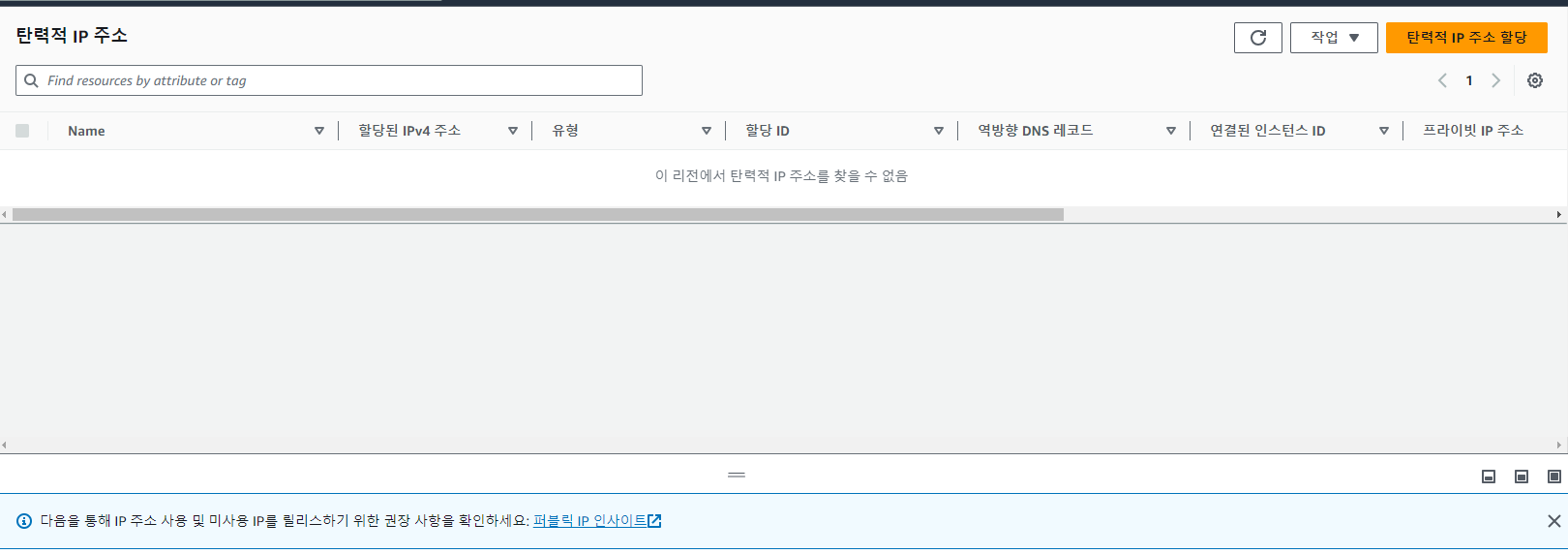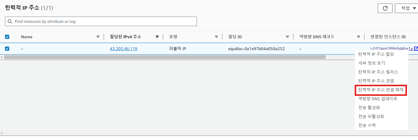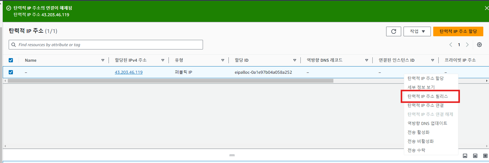 네트워크 및 보안 > 탄력적 IP > 작업 > 탄력적 IP주소연결 해제
