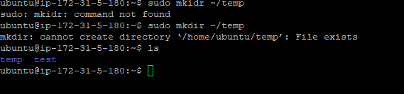 sudo mkdir /home/ubuntu/temp/test : test를 만들기위해서 temp라는 디렉터리가 존재해야하는데 temp디렉터리가 존재하지 않기때문에 error가 발생한다.
